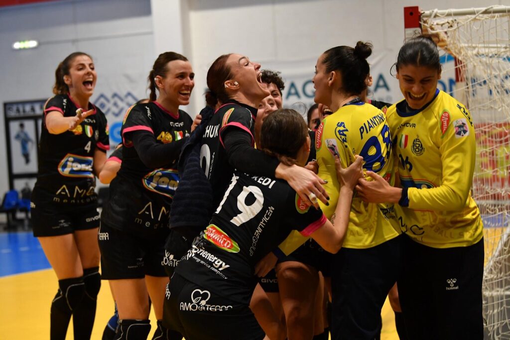 Emozioni, adrenalina, e anche un pizzico di fortuna che pure non guasta mai. C’è questo e tanto altro nell’approdo agli ottavi di finale di EHF Cup della Jomi Salerno, che supera il secondo turno della competizione europea grazie al successo dopo i i rigori nella sfida di ritorno contro l’Energa Start Elblag. Il pari maturato nella gara d’andata in Polonia si ripete anche alla Palestra Palumbo, dove le due formazioni si danno battaglia per tutto l’arco del match chiudendo i tempi regolamentari sul 28-28. A partire meglio sono le ospiti, che cercano in più di un’occasione la fuga, brave le padrone di casa a restare attaccate alla sfida, soprattutto grazie alle reti di Asia Mangone in stato di grazia (ben 8 i gol per lei), dopo il 14-15 dell’intervallo l’Energa tocca anche il + 4 nella ripresa, poi dieci minuti di fuoco della formazione di coach Leandro Araujo, capace di portarsi anche sul 27-25. Le salernitane però non riescono a capitalizzare il doppio vantaggio nei minuti finali (28-26 al 55′), rischiando nel finale: con il palo colpito dal team avversario a pochi secondi dalla sirena. Si va così ai rigori. Nonostante il portiere polacco Ciacka – già protagonista nei 60′ regolamentari con quattro parate dai sette metri – neutralizzi subito il tentativo di Andriichuk, la Jomi resta in corsa grazie all’intervento decisivo di Piantini, preludio al gol del 32-32 firmato da Gomez che porta la sfida ad oltranza. Nel dentro-fuori finale è Lauretti Matos a segnare il rigore della possibile qualificazione, mentre Zych colpisce il palo consegnando a Salerno la vittoria e l’accesso agli ottavi di finale. Esplode così la festa al Pala Palumbo: la Jomi continua il suo cammino europeo, approda per la prima volta della propria storia agli ottavi di finale della competizione continentale e può ora tornare a concentrarsi sul campionato di serie A1. Domani, infatti, le campionesse d’Italia in carica dovranno affrontare la trasferta valevole per il recupero della sfida contro Casalgrande Padana, sabato invece big match contro la capolista Brixen tra le mura amiche della Palestra Palumbo.