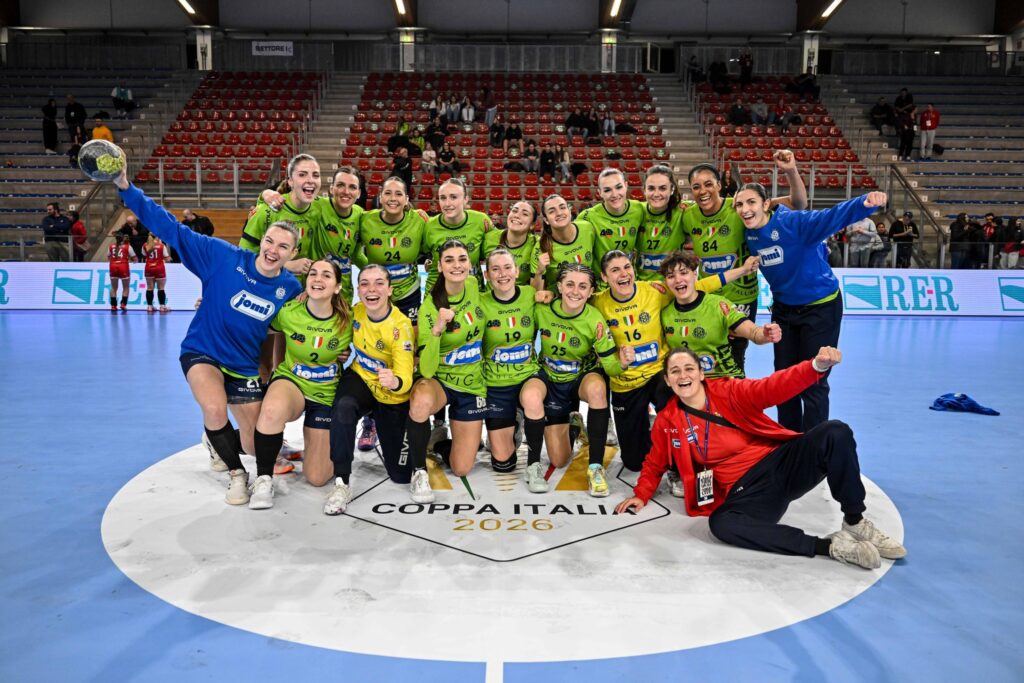 Dopo lo Scudetto della stella, la Coppa Italia dei record. Quella che permette alla signora della pallamano italiana di diventare la formazione più vincente della competizione. Il settimo titolo vale infatti l’agognato sorpasso a Sassari, staccata dopo anni di coabitazione a quota sei, e fa entrare ancora di più nell’olimpo dello sport la Jomi Salerno. Era dal 2020 che mancava il trionfo del definitivo sorpasso, arrivato nel pomeriggio di domenica al termine di una finale emozionante e vissuta sul filo dell’equilibrio contro Erice, reduce da tre successi di fila e autentica bestia nera in stagione della Jomi. Al PlayHall di Riccione ci vogliono i tiri di rigore per chiudere la contesa, dopo una gara a dir poco combattuta, con entrambe le squadre che hanno lasciato davvero tutto sul parquet dell’impianto romagnolo. Dopo un quarto d’ora Salerno è avanti 5-7, ma Erice risponde con un parziale di 3-1 che riporta il punteggio in parità sull’8-8 al 25′. Si va al riposo sul 10-10, risultato che fotografa perfettamente l’andamento di una gara giocata colpo su colpo. Nella seconda frazione la formazione di coach Chirut tenta la fuga: al 46′ Mangone realizza il 15-18 e la squadra guidata da coach Chirut arriva fino al +4 grazie a Gislimberti. Erice, però, non molla e torna sotto fino al 21-22 a cinque minuti dal termine. Nel finale incandescente, dopo il 22-24 e il 23-24 firmato da Gandulfo, Salerno spreca l’ultimo attacco: Iacovello neutralizza Andriichuk e, sull’azione successiva, Barbosa trova il 24-24 che manda la sfida ai supplementari. Anche l’extra time è ricco di emozioni, con Erice avanti 29-28, Nukovic si procura un sette metri che Andriichuk trasforma con freddezza, rinviando tutto ai rigori. Dai sette metri la Jomi è perfetta (5 su 5), con De Santis a mettere il sigillo finale, per Erice pesa l’errore di Ahanda. È festa grande per il club di patron Pisapia, che scrive un’altra pagina memorabile della propria storia e si laurea la squadra più vincente della Coppa Italia.